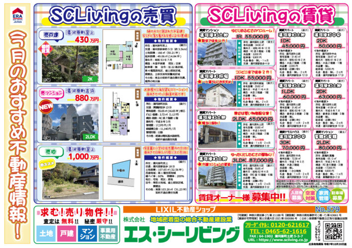 また、オススメ不動産として今月は湯河原の売中古戸建、売マンション、売地をご紹介しています。購入いただいた不動産のリフォームや新築・注文住宅もワンストップでご提案いたしますので是非お気軽にお問い合わせ下さい!
