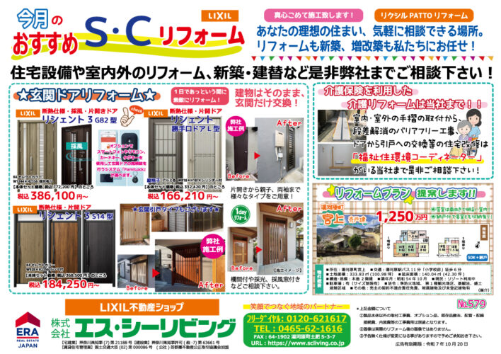 令和7年9月度広告を公開しました。今月のおススメリフォームは玄関ドアリフォームです。片開きドアや親子ドアなどの一般的なドアから、片引きや引き違いなど様々なタイプをご用意しています。ワンデーリフォームですので、工事は1日で完了、補助金などの相談も随時受付けておりますので、お気軽にご相談ください。