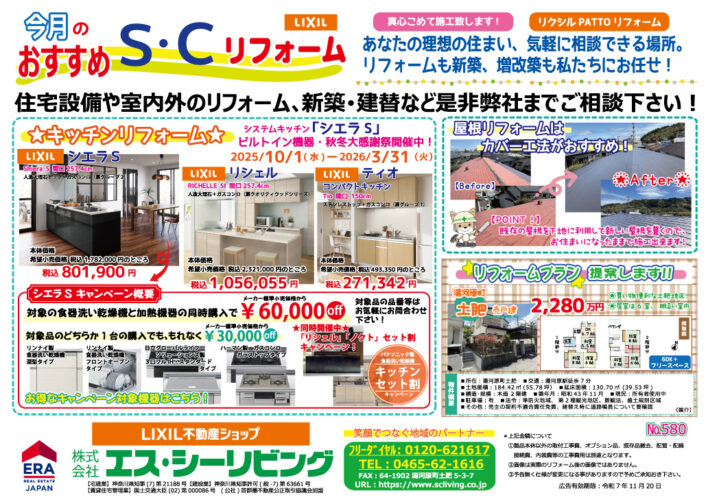令和7年10月度広告を公開しました。今月のおススメリフォームはキッチンリフォームです。システムキッチン「シエラS」ではビルトイン機器・秋冬キャンペーンを開催中です!対象の食器洗い乾燥機やIHコンロ、ガスコンロを同時購入いただくと、メーカー希望小売価格から60,000円または30,000円オフとなります。詳細は弊社スタッフまでお問い合わせ下さい。