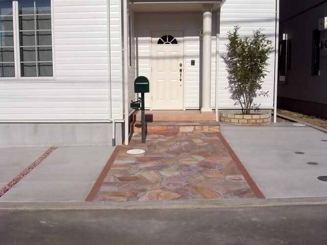 弊社が施工した事例として、玄関までの導線を緩やかなカーブにした