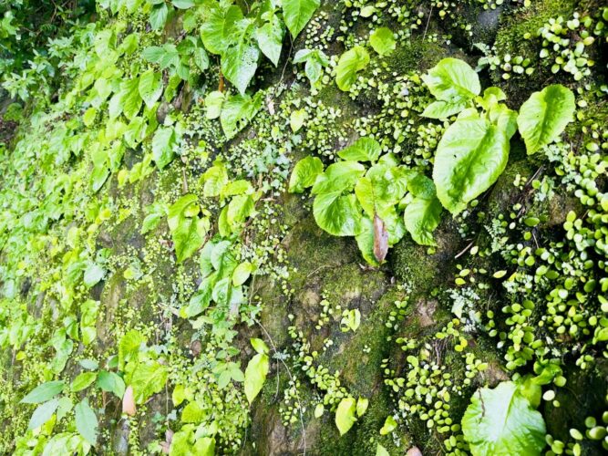 隙間にシダ類やコケを配置すれば、まるで何十年も前からそこ